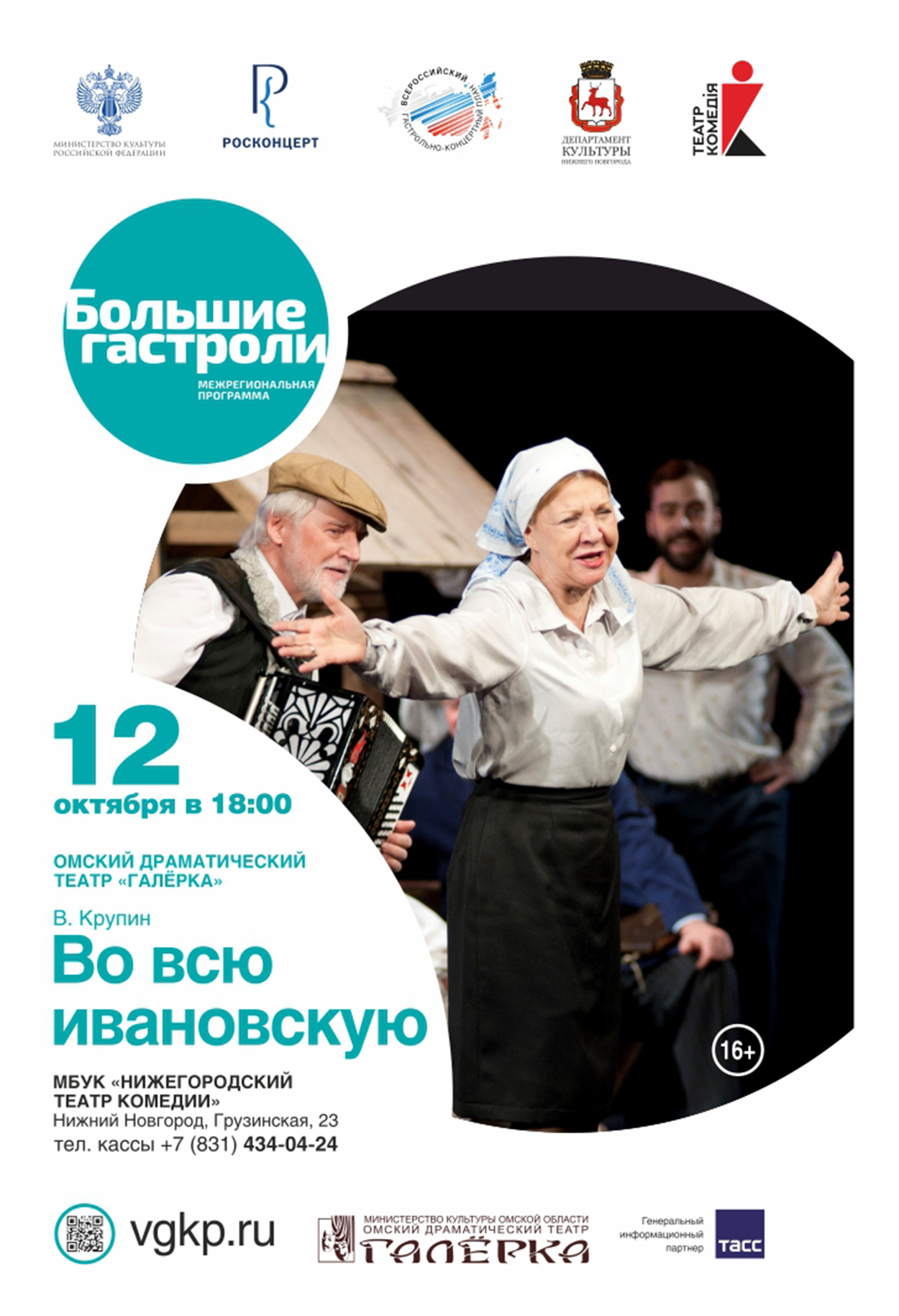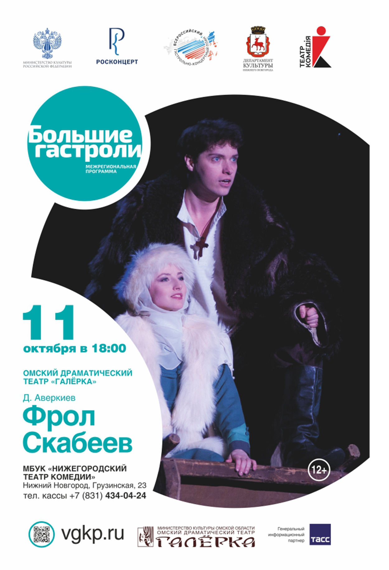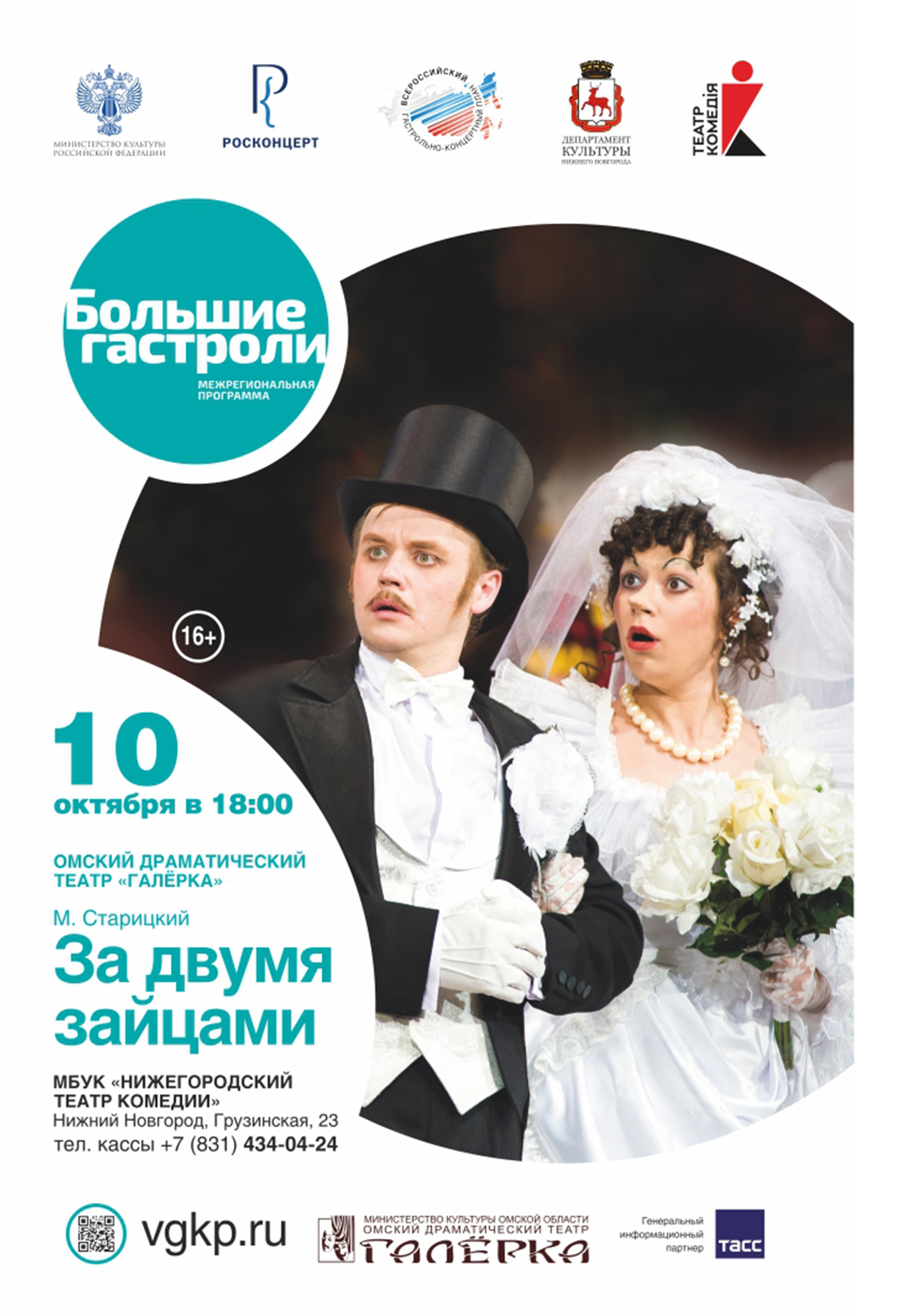С 10 по 12 октября 2025 года состоятся «Большие гастроли» Омского драматического театра «Галёрка» в Нижнем Новгороде, организованные ФГБУК РОСКОНЦЕРТ согласно Всероссийскому гастрольно-концертному плану Министерства культуры Российской Федерации. В рамках межрегионального направления «Больших гастролей» на сцене нижегородского театра «Комедiя» пройдут показы спектаклей «За двумязайцами», «Фрол Скабеев», «Во всю Ивановскую».